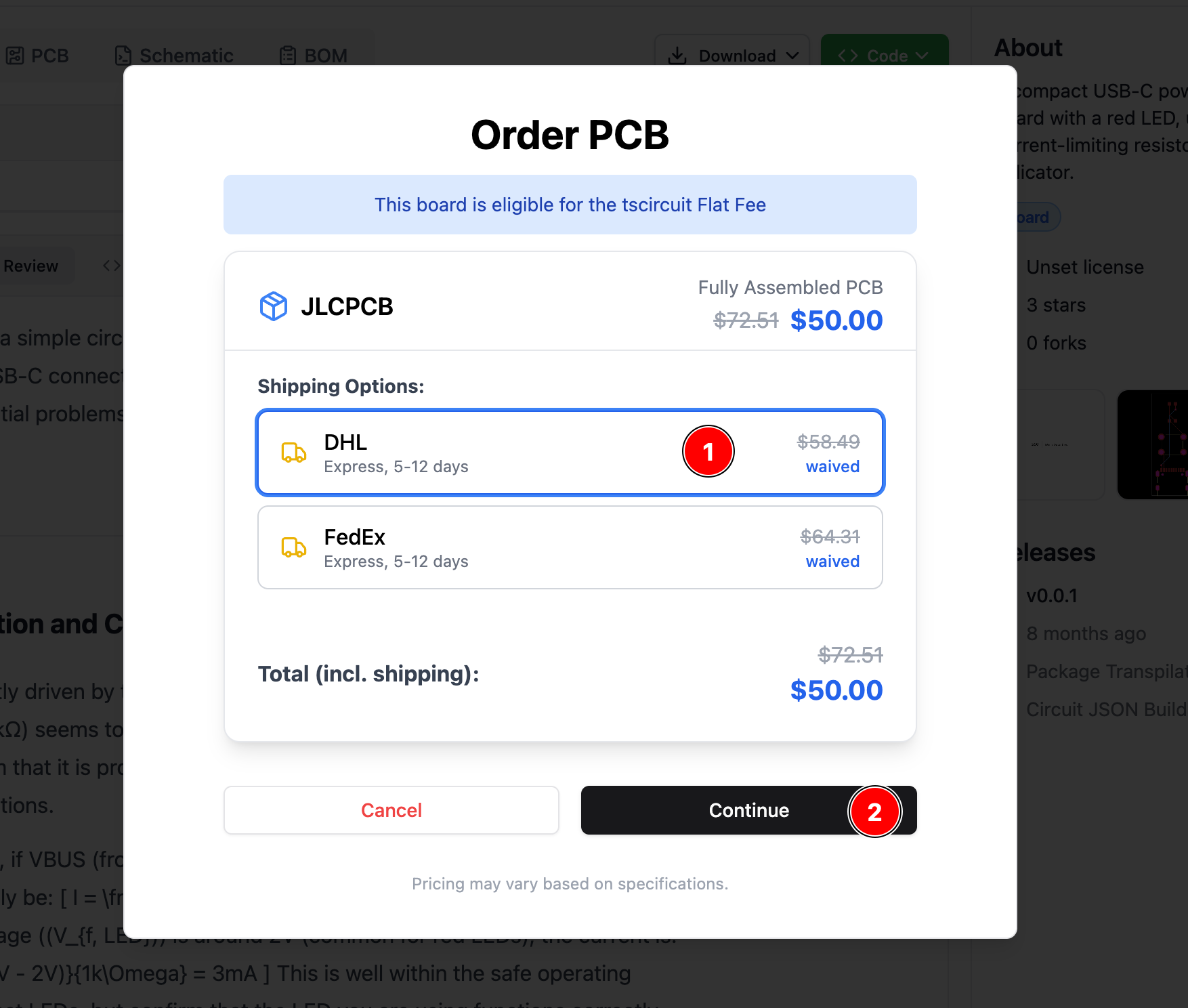 The easiest way to order your prototypes is through the tscircuit platform, which handles the entire ordering process for you. Before placing your order, there are two important component properties that affect the ordering process: